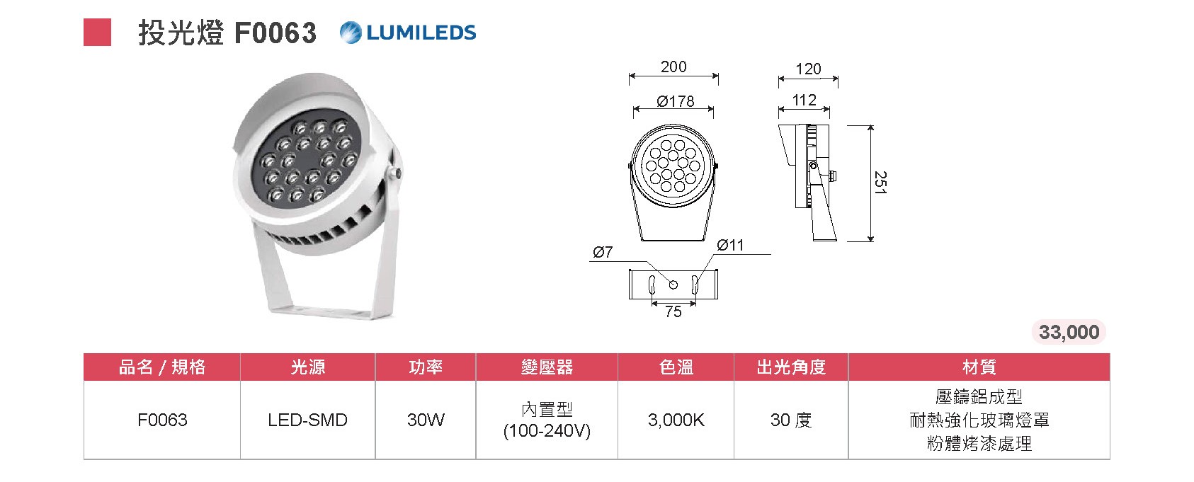 ▶【高效實用亮度】採用 LUMILEDS LED-SMD 光源,輸出 30W 穩定光效,搭配 30° 出光角度,適用於中型景觀與立面照明需求。